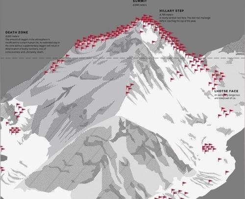 Список смертей на самой высокой горе мира — 312 человек, при этом он регулярно пополняется. Большинство погибли даже не на подъёме, а во время спуска. На этой картинке обозначены все места, с которых так и не убраны тела павших альпинистов.