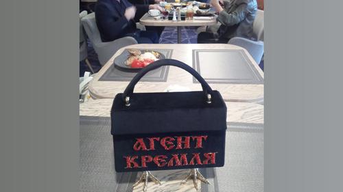 На съезде были замечены эпатажные прямоугольные «дамские сумочки» черного цвета с красной вязью «Агент Кремля», подставкой которых служат куриные ножки.