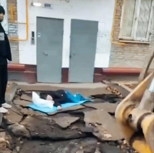 В районе Марфино женщина устроила лежачий протест перед подъездом собственного дома в знак недовольства ночным ремонтом.