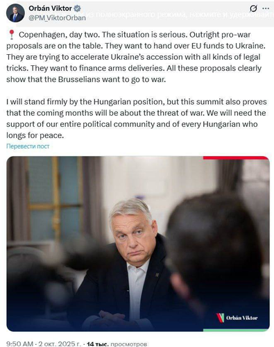 «Все эти инициативы ясно указывают: в Брюсселе хотят войны. Ситуация серьёзная, и ближайшие месяцы будут связаны с угрозой её начала», — отметил Орбан.