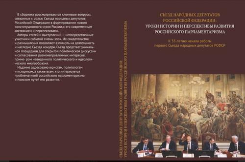 Вышел в свет сборник статей и выступлений «Съезд народных депутатов Российской Федерации: уроки истории и перспективы развития российского парламентаризма (к 35-летию начала работы первого Съезда)». Конференция на эту тему состоялась в МГЮА им. О.Е. Кутафина 16 мая с.г. Научное издание выпущено совместно этим университетом и Издательством «Проспект».