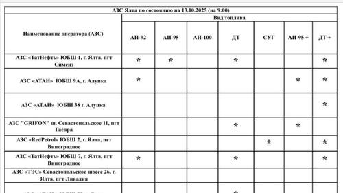 Власти Крыма ежедневно публикуют наличие топлива на автозаправочных станциях: глава правительства делает публикацию в соцсетях по всем АЗС региона, а мэры городов дублируют ее выборочно для своего муниципалитета. И если в других городах указано: номер заправки, адрес, какой вид топлива имеется в наличие и сколько стоит, то в Ялте вместо цены везде проставлены звездочки.