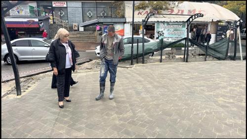 На фото с выезда мэра на проверке её сопровождает строитель в сильно запачканной рабочей одежде, которая сильно контрастирует с чистым нарядом проверяющей стороны.