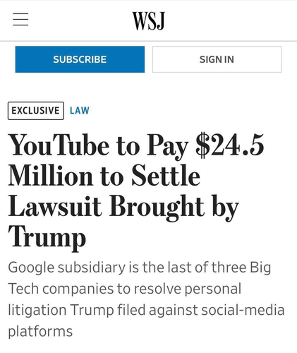 YouTube согласился выплатить $24,5 млн для урегулирования иска Дональда Трампа, который он подал после блокировки его аккаунта в 2021 году из-за событий в Капитолии. Alphabet, владелец YouTube, стала третьим технологическим гигантом после Meta* ($25 млн) и X ($10 млн), который предпочел откупиться от президента.